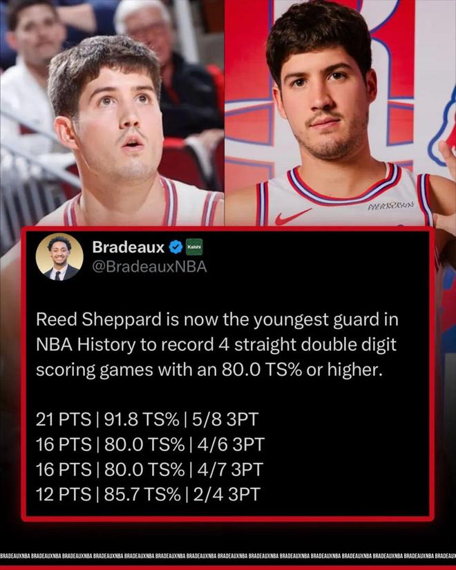 以及,还有这么一个数据,谢泼德是NBA历史至今最年轻的连续4场得分上双,且真实命中率不低于80%的后卫。